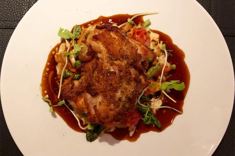 Harissa Cornish Hen – boneless hen, market vegetables, tomato & white bean ragu, red wine jus.