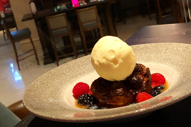 Chef’s Raspberry Bread Pudding – butterscotch sauce, Madagascar vanilla ice cream.